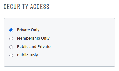 - Public Only: Content set to this level will not be viewable by Sun City Texas residents and will only be viewable by outside people. Most likely, you will never use this security access setting. Its use is mostly confined to the Community Association content.