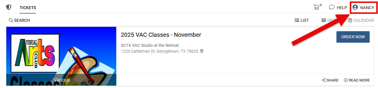 This screen shows your recent ticket orders, up to the last 2 years. Clicking on the View button shows your order confirmation and allows you to print your tickets.